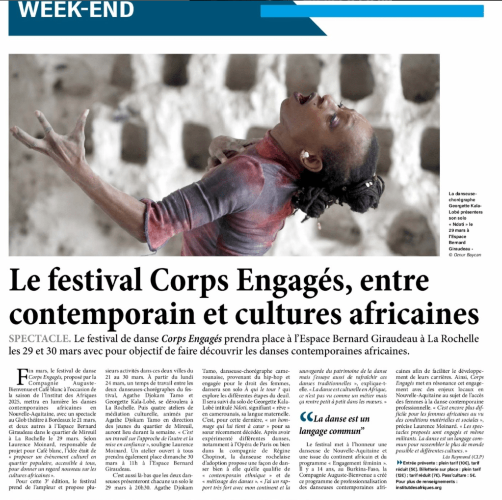 Co-organisé par l’Institut des Afriques, la Compagnie Auguste-Bienvenue & Café Blanc connexions culturelles cosmopolites, Corps engagés met à l’honneur une danseuse du continent africain et une danseuse de Nouvelle-Aquitaine, dans la continuité d’Engagement Féminin, programme panafricain de professionnalisation des danseuses contemporaines africaines. Corps engagés met ce programme en résonance avec nos enjeux, sur les territoires rochelais et bordelais, en matière d’accès des femmes à la danse contemporaine professionnelle.